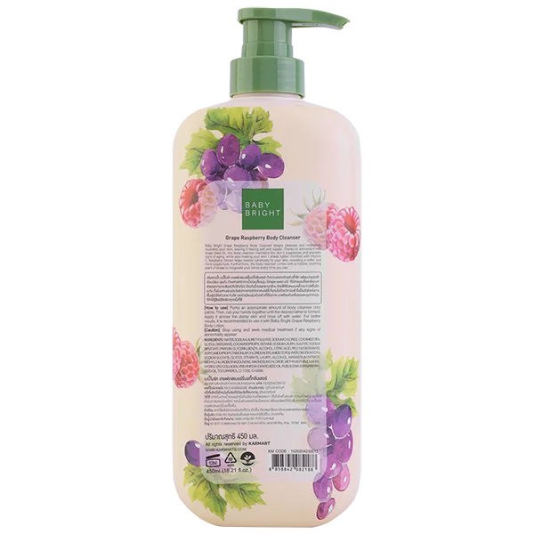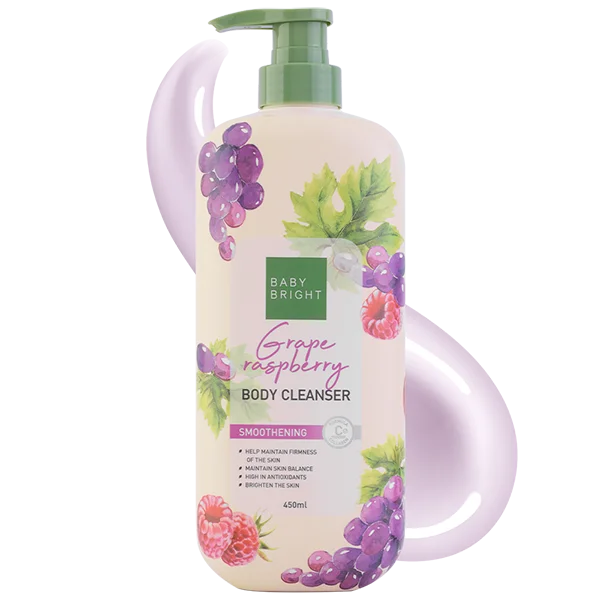 Indulge in luxurious skincare with Baby Bright Grape Raspberry Body Cleanser. This enriching formula deeply cleanses and intensively nourishes your skin, leaving it soft, supple, and 1 shade lighter. Infused with antioxidant-rich Grape Seed Oil and Vitamin C-packed Raspberry Extract, this body cleanser maintains skin suppleness, prevents signs of aging, restores luminosity, and reveals a softer, more radiant complexion. Enjoy the mellow, soothing scent of Grape with every use for an invigorating experience.