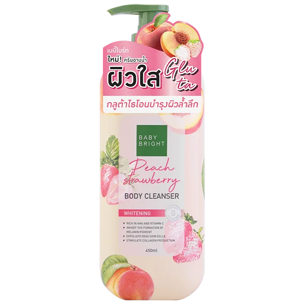 Indulge in a luxurious cleansing experience with Baby Bright Peach Strawberry Body Cleanser. This nourishing formula deeply cleanses and intensely nourishes your skin, leaving it with a radiant pinkish glow. Enriched with Vitamin C, Peach Extract, and Strawberry Extract, this body cleanser helps reverse dullness, promote even skin tone, accelerate skin exfoliation, and boost collagen production for a youthful appearance.