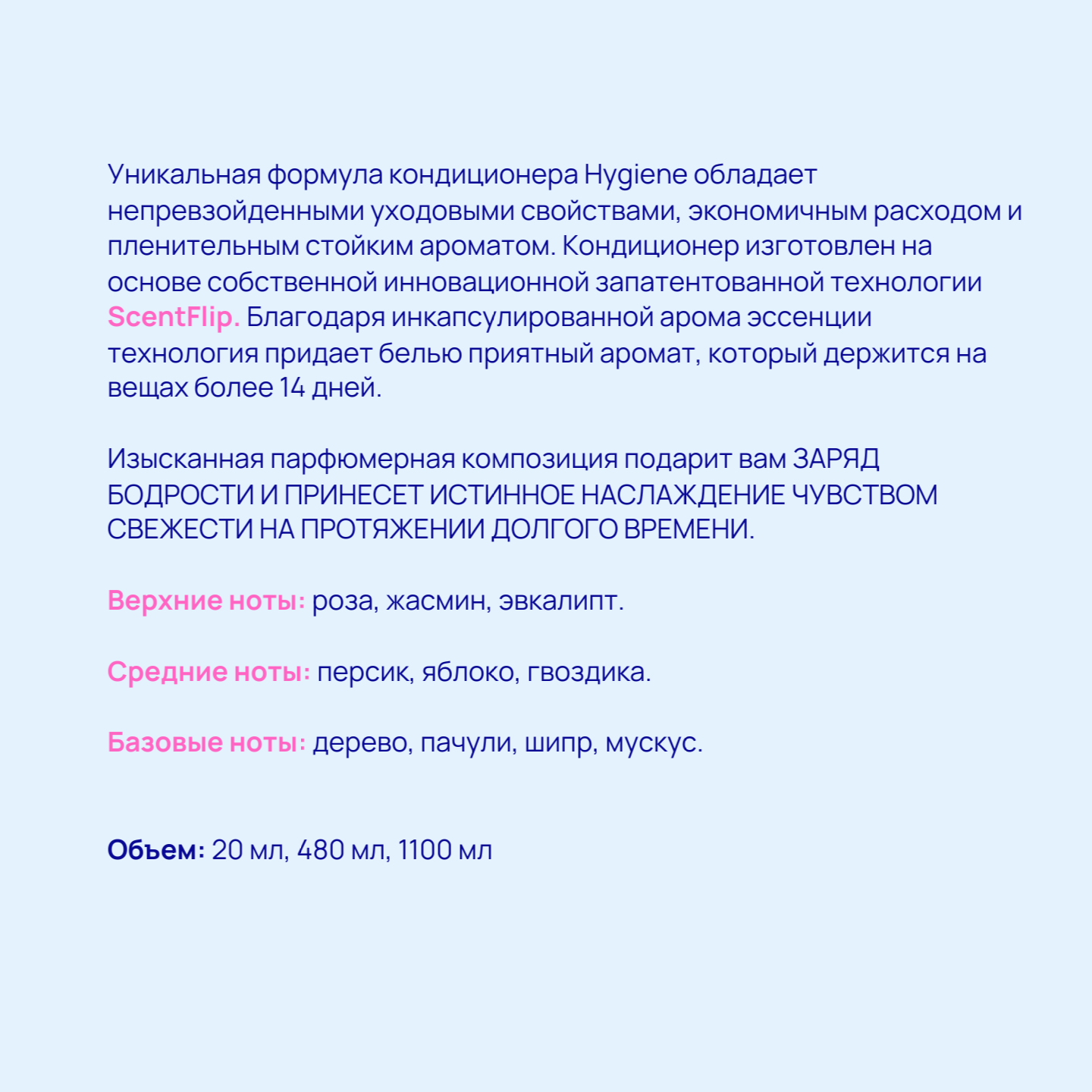 0 Нет отзывов Концентрированный парфюмированный кондиционер для белья "Утренняя свежесть" 480 Кондиционеры для белья 980 ₽ 480 20 мл Объем 25.00 мл В корзину Описание Использована инновационная запатентованная технология ScentFlip. Изысканная парфюмерная композиция подарит заряд бодрости и принесет истинное наслаждение чувством свежести на протяжении долгого времени.
