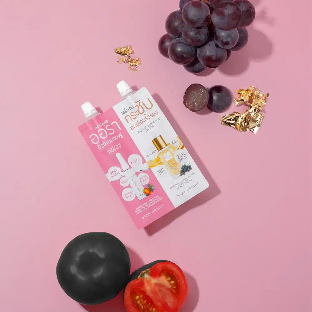 Firm and brighten your skin for a plump look with Baby Bright Ageless Whitening Set, a 2in1 day & night set consisting of 1. Baby Bright Ageless 24K Gold Serum and 2. Baby Bright Gluta Hya Ampoule. Ageless 24K Gold Serum is infused with 24K Gold (99.99% pure) and antioxidant-rich Collagen HP for a hydrated and wrinkleless skin. Black Cohosh Extract, Grape (Joybliss), Oligopeptide-1, and Ceramide Complex protect and lessen wrinkles for a naturally firm skin. Gluta Hya Ampoule is packed with Glutathione, a powerful antioxidant that gives your skin a natural pinkish glow. Super-HYA locks in hydration and repairs damaged skin, while Black Tomato Extract, Amino Acid Complex, and Defensil Pure aid in locking in hydration and replenishing the skin’s moisture levels, while preventing moisture loss and improving the skin’s strength.