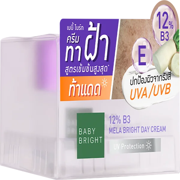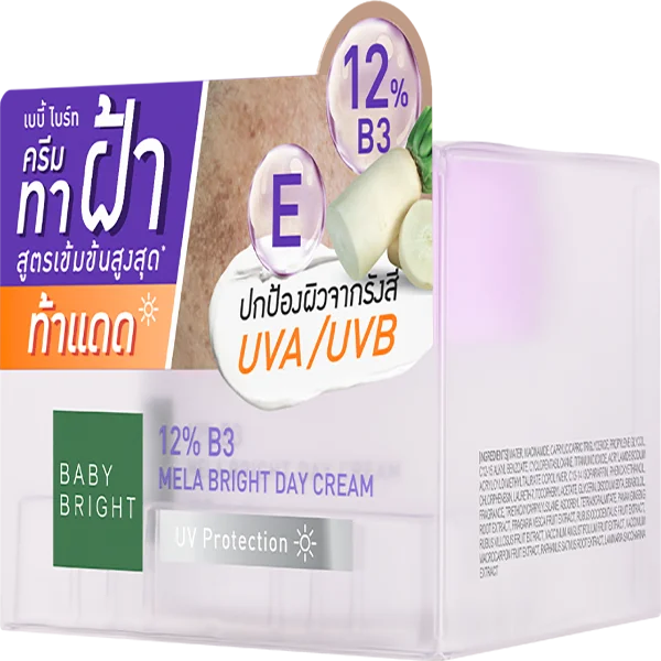 Get an incomparably bright and clear skin with Baby Bright 12% B3 Mela Bright Day Cream. This powerful formula features Cranberry Extract, which is enriched with Vitamin E and Vitamin B3, to brighten your complexion and reduce the appearance of spots, melasma, and freckles. Radish Extract and Titanium Dioxide, acting as a UV protector, shield your skin from harmful UVA and UVB rays to help prevent sun damage and maintain a radiant glow.