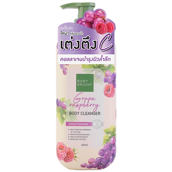 Indulge in luxurious skincare with Baby Bright Grape Raspberry Body Cleanser. This enriching formula deeply cleanses and intensively nourishes your skin, leaving it soft, supple, and 1 shade lighter. Infused with antioxidant-rich Grape Seed Oil and Vitamin C-packed Raspberry Extract, this body cleanser maintains skin suppleness, prevents signs of aging, restores luminosity, and reveals a softer, more radiant complexion. Enjoy the mellow, soothing scent of Grape with every use for an invigorating experience.